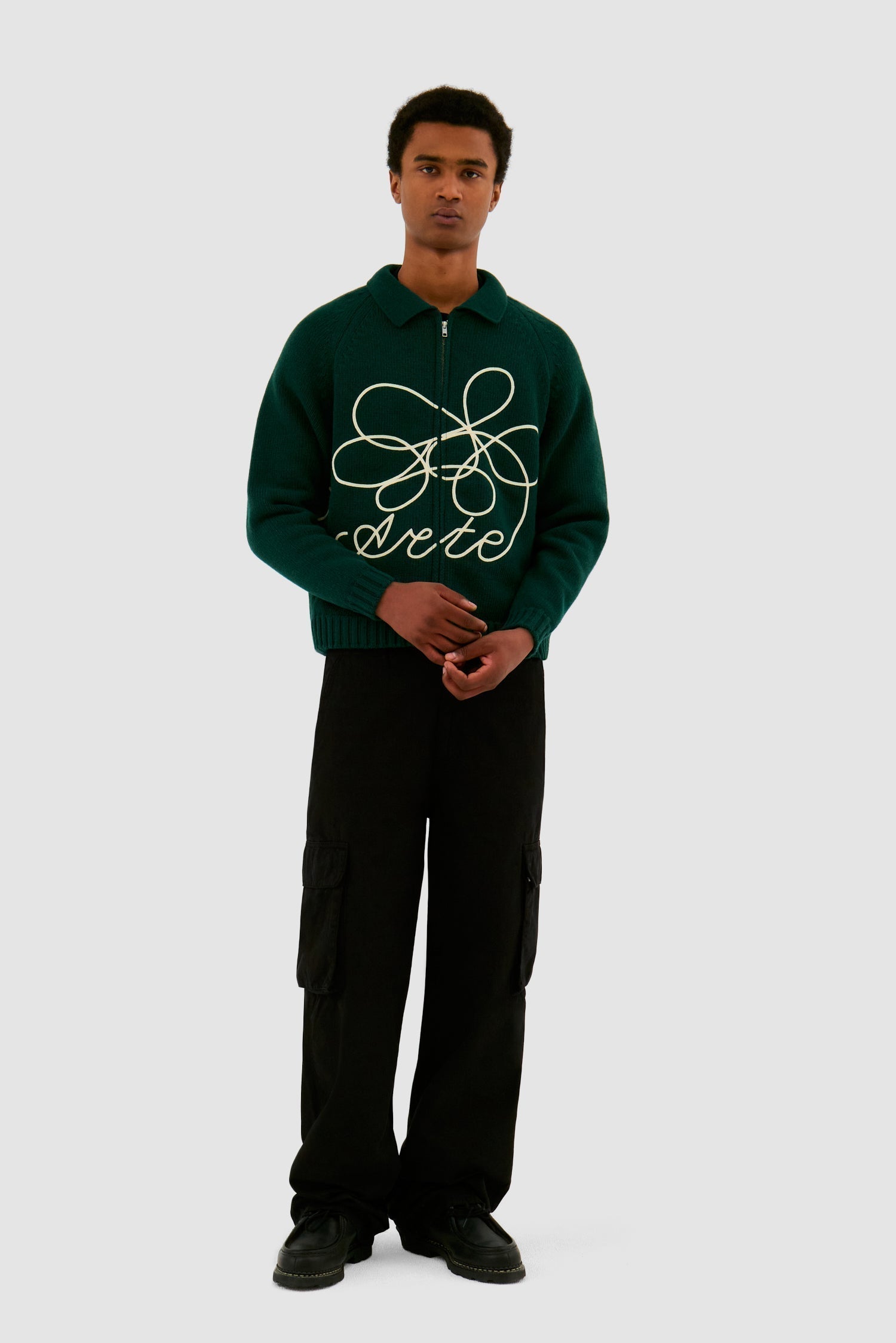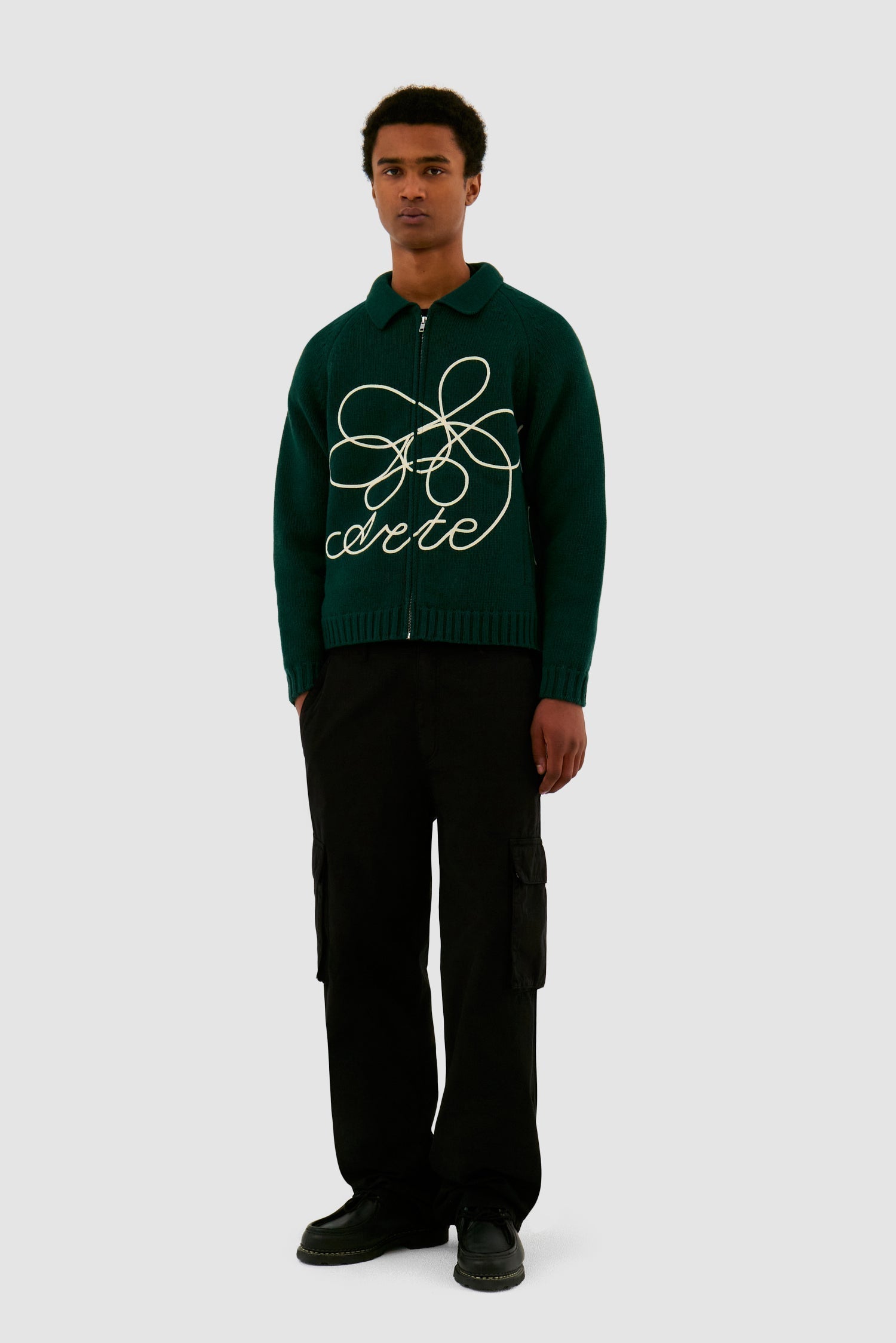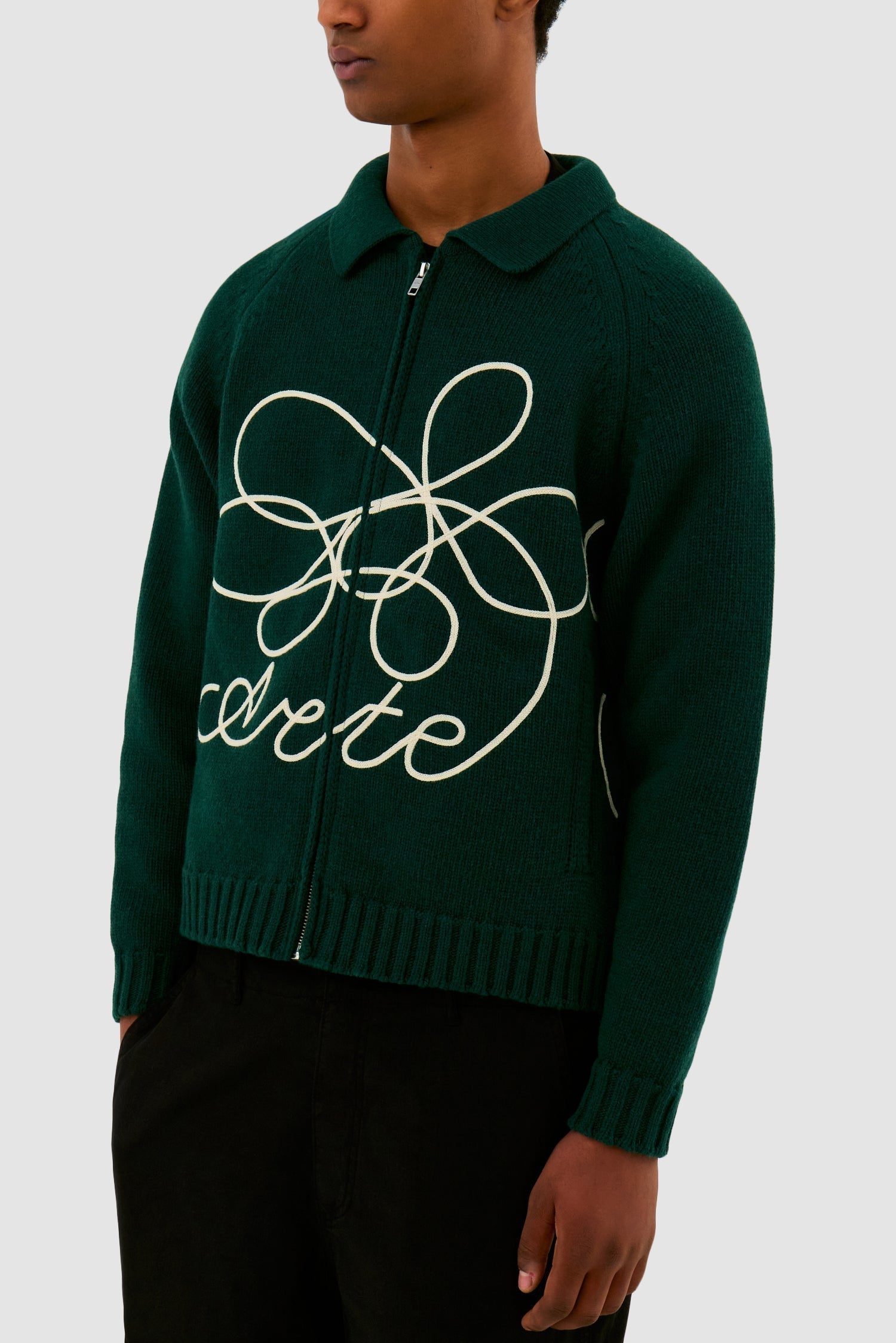 Fabriqué à partir d’un mélange de laine de haute qualité, le pull en maille vert avec logo Flower est orné d’un cordon brodé qui s’enroule autour de tout le corps. Il présente une coupe ample avec un corps légèrement plus court et est équipé d’une fermeture éclair intégrale ainsi que de deux poches latérales.